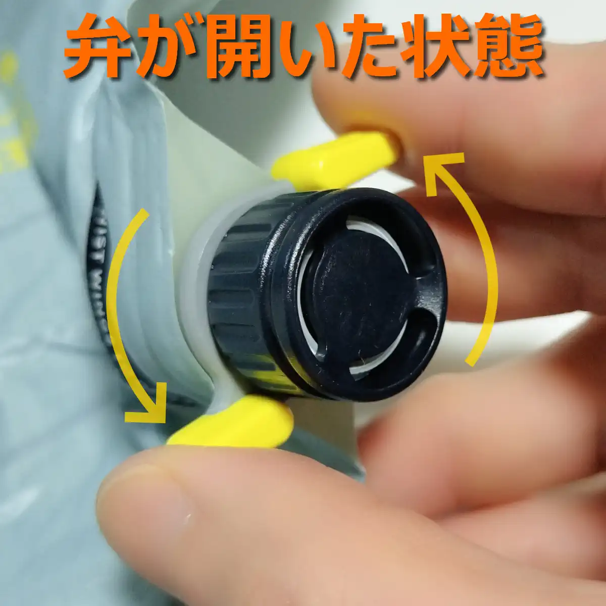 バルブを反時計回りにまわして開きます。カチッ、カチッと2段階、引っかかるポイントがあります。