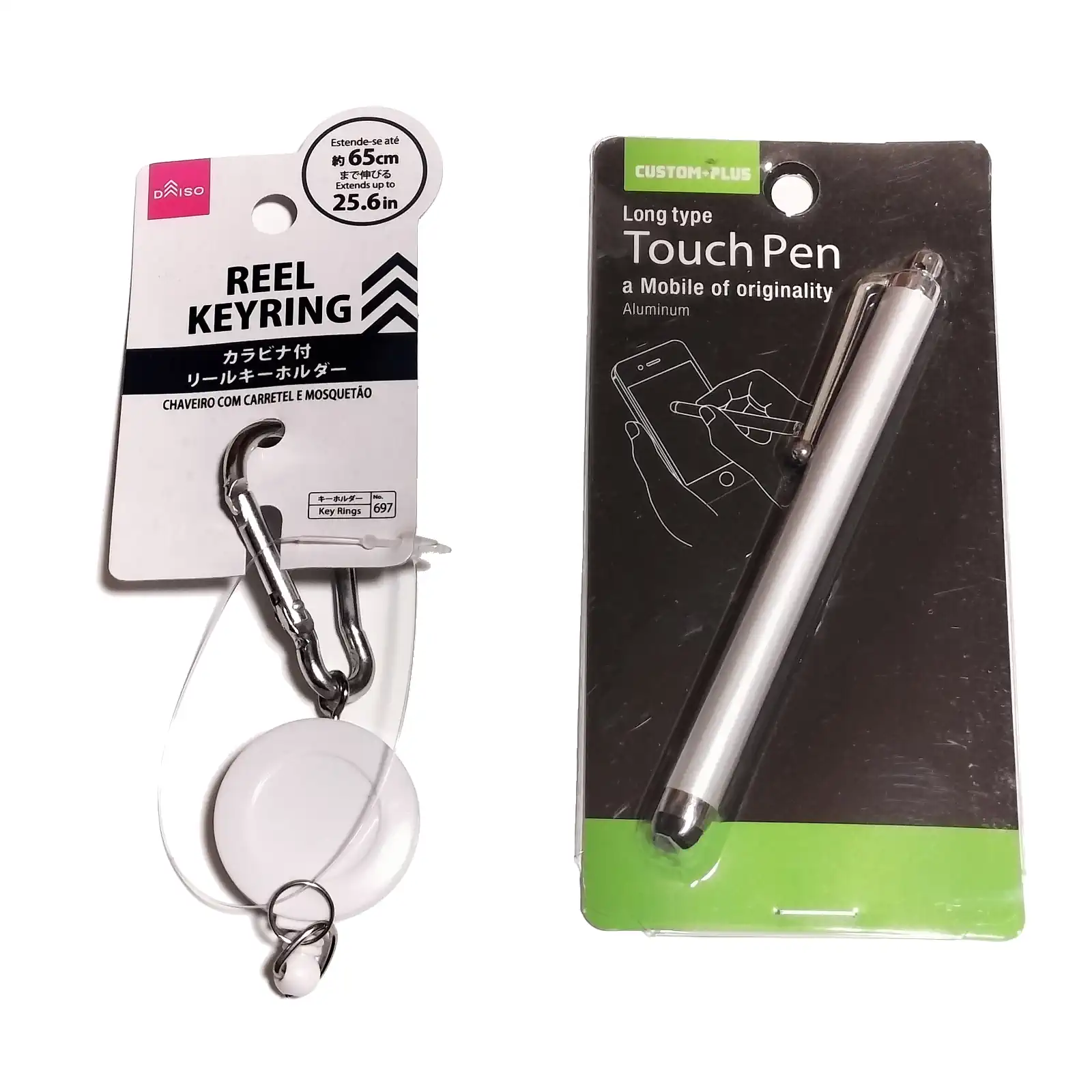 - リールキーホルダーと、クリップ付きのタッチペンを用意します。100均のもので十分。