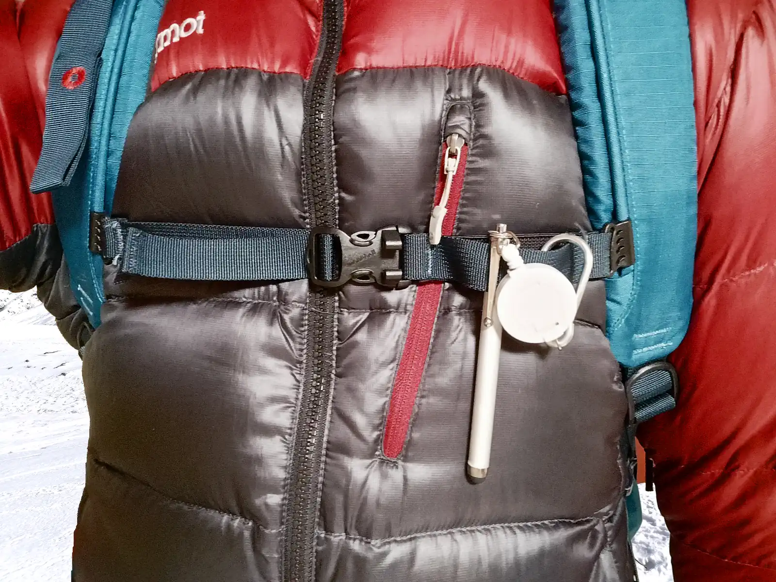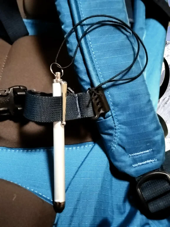 - キーホルダー側のミニカラビナをバックパックのチェストストラップに取り付けます。そして、タッチペンのクリップをチェストストラップに挿します。