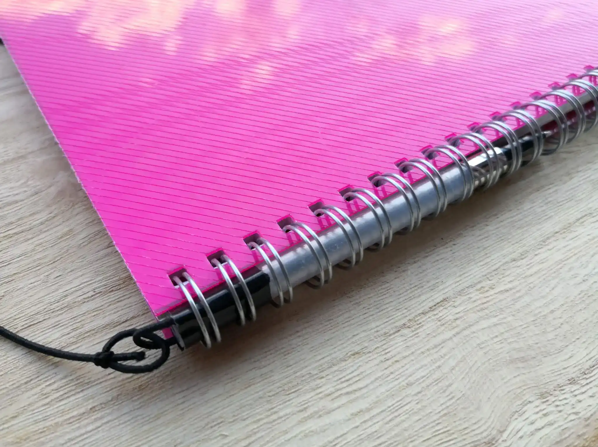 ゴム紐のリーシュをノートのリングに通します。