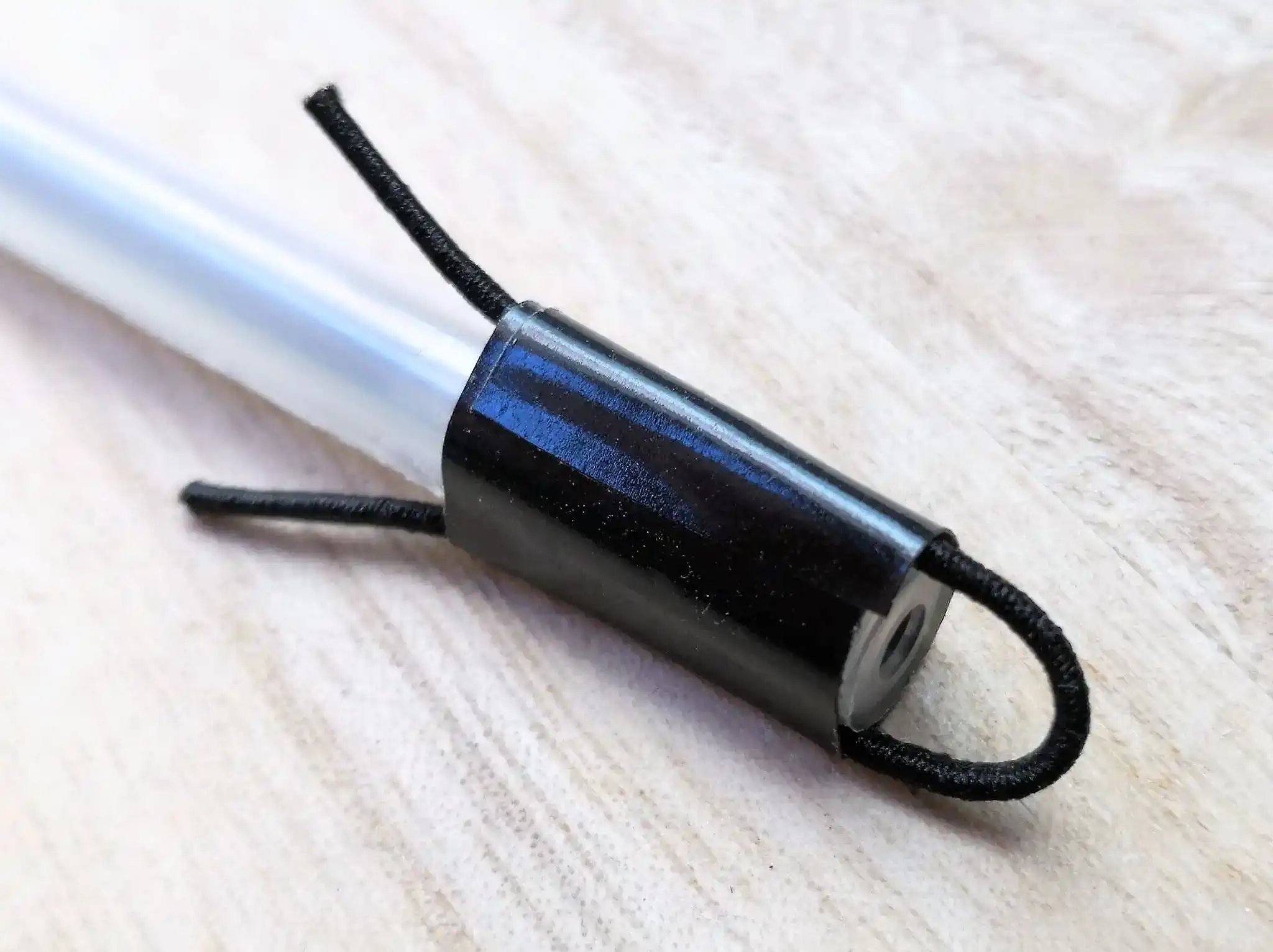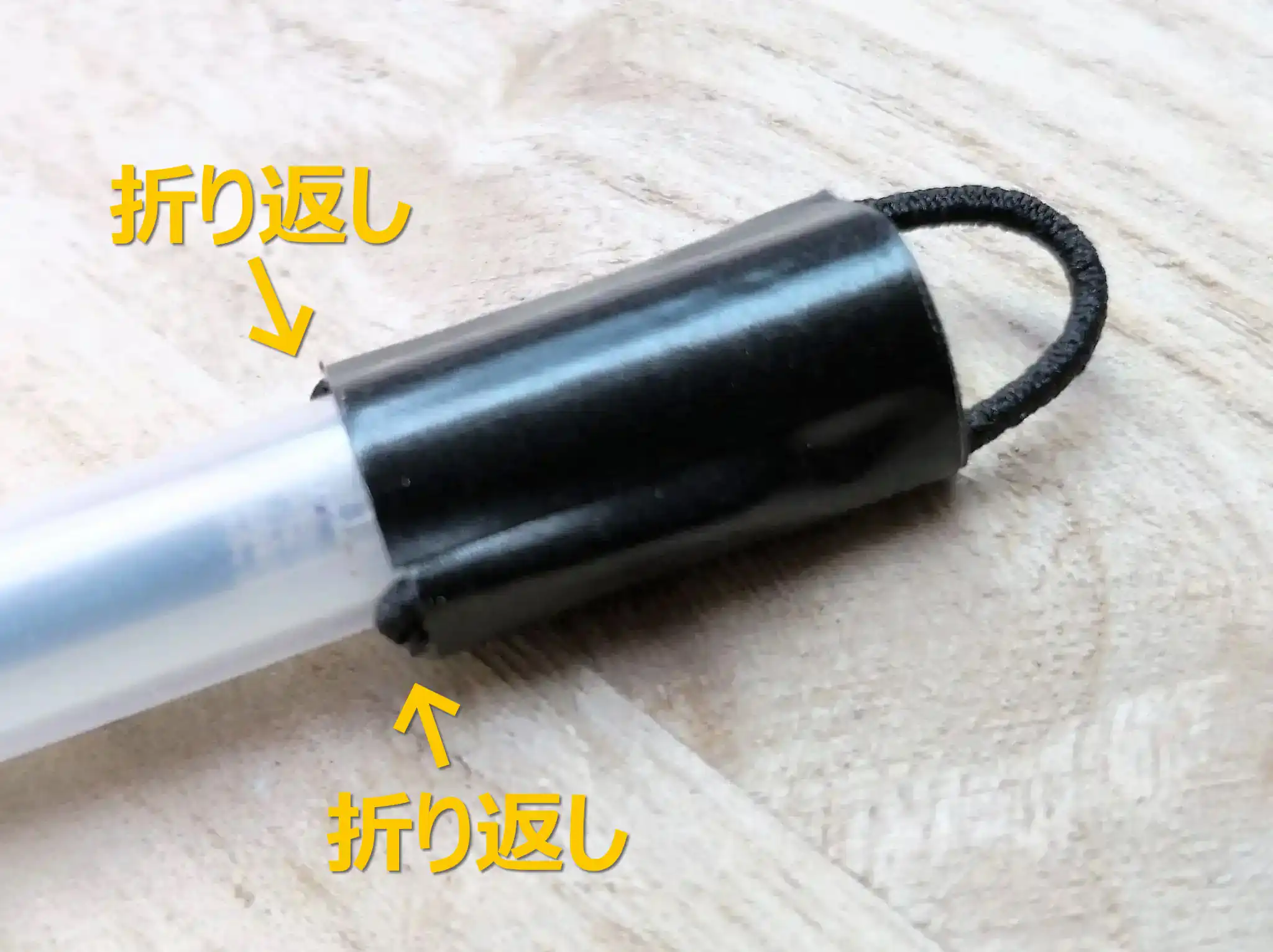 リフィルの尻に数センチのゴム紐をU字型に当てがって、黒いビニールテープでひと巻きします。これだけだとゴム紐がすっぽ抜けやすいです。