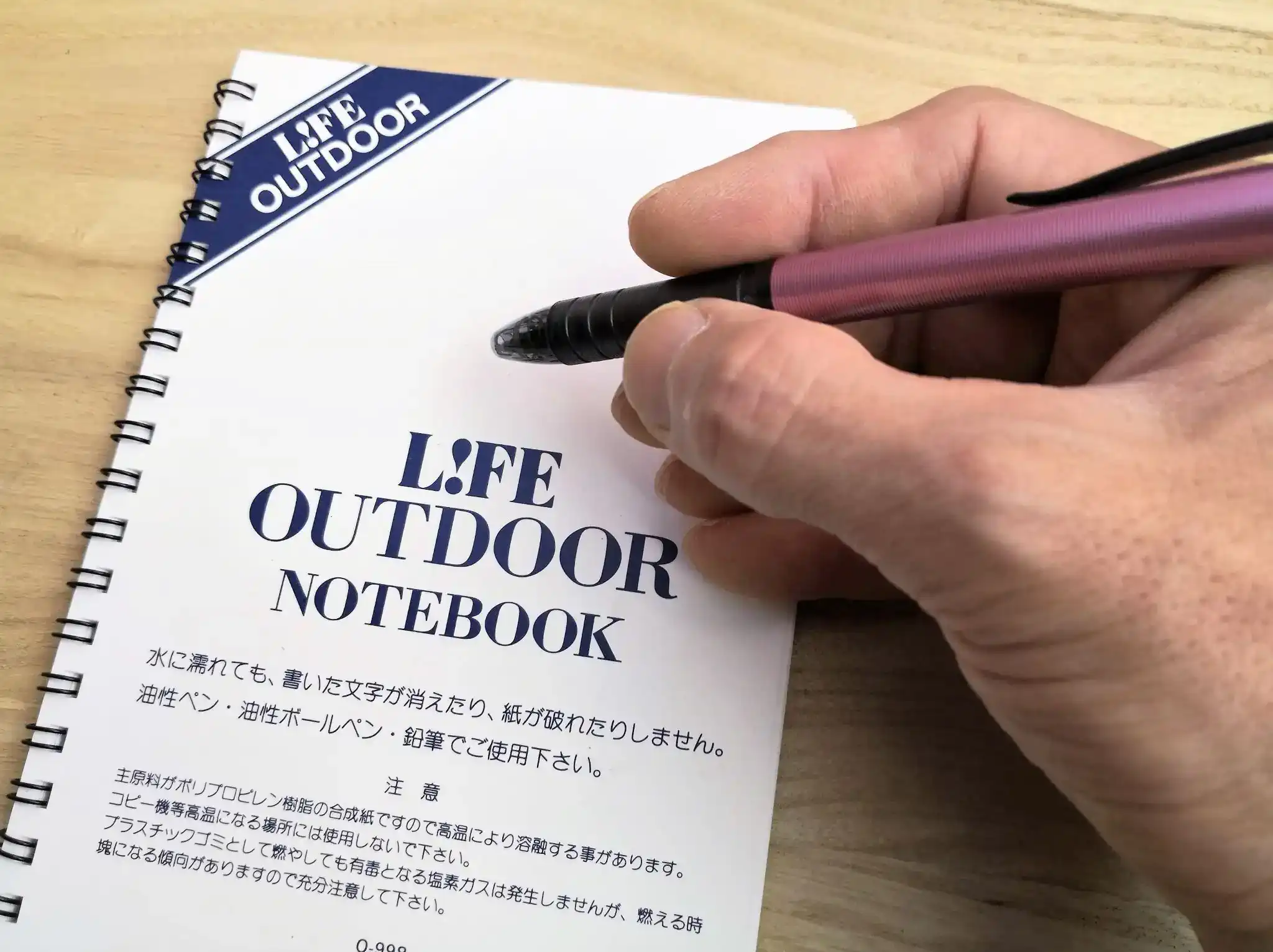 ライフの「アウトドアノート B6」と組み合わせました。耐水紙なので防滴対策に気を使わずにすみます。ダブルリングにボールペンのクリップを引っ掛けてペンホルダーにできます。